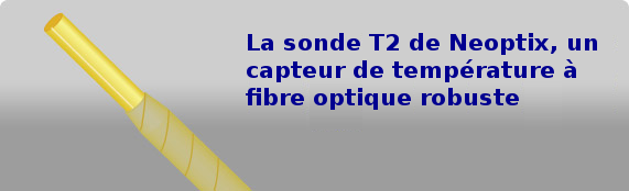 Etant donné que l’élément sensible de la sonde de température T2 de Neoptix est complètement enfermé à l’extrémité de la gaine en Téflon, on ne risque pas de dessouder cet élément pendant la manipulation et l’installation. Il n’y a aucun lien externe autour de l’élément sensible, ce qui évite les problèmes mécaniques de bris de sondes dues au stress provenant des vibrations et cycles thermiques. La fibre optique est ensuite collée sur la gaine de protection à proximité de l’élément sensible avec de l’époxy et Téflon à haute température.